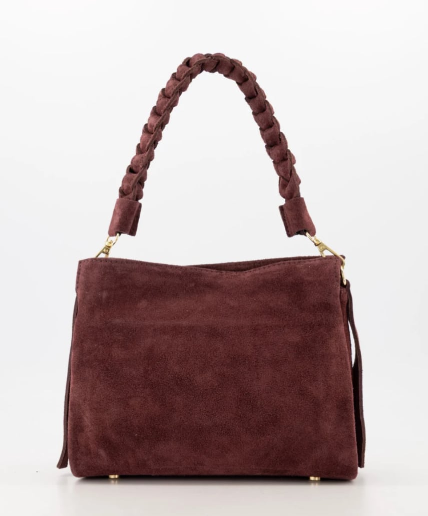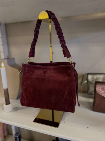 Deze suede bordeaux handtas mag niet ontbreken in jouw garderobe. Verstelbaar hengsel, kan als schoudertas en als crossbody. Fijne ritssluiting.